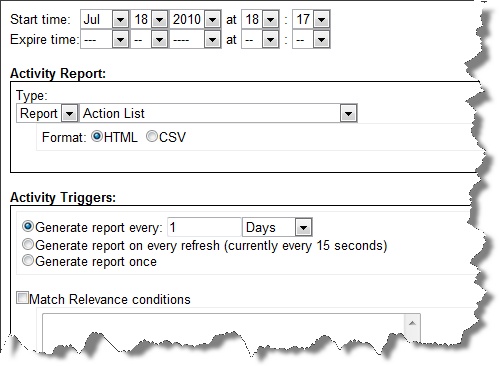 - The Activity Triggers section is where you specify how you want to trigger your event. The most popular technique is to set a time period, such as every day or week, to trigger the report (or other activity). However, there are many other useful ways to trigger a report, as described later in this guide.