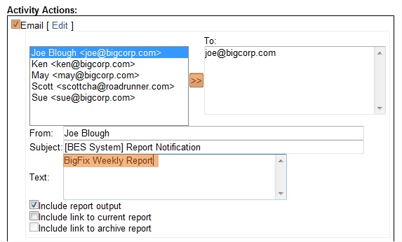 Typically that is just to email your report. To do this, click the Email check box, add contacts from your Address book, and set the subject line for the emailed report.