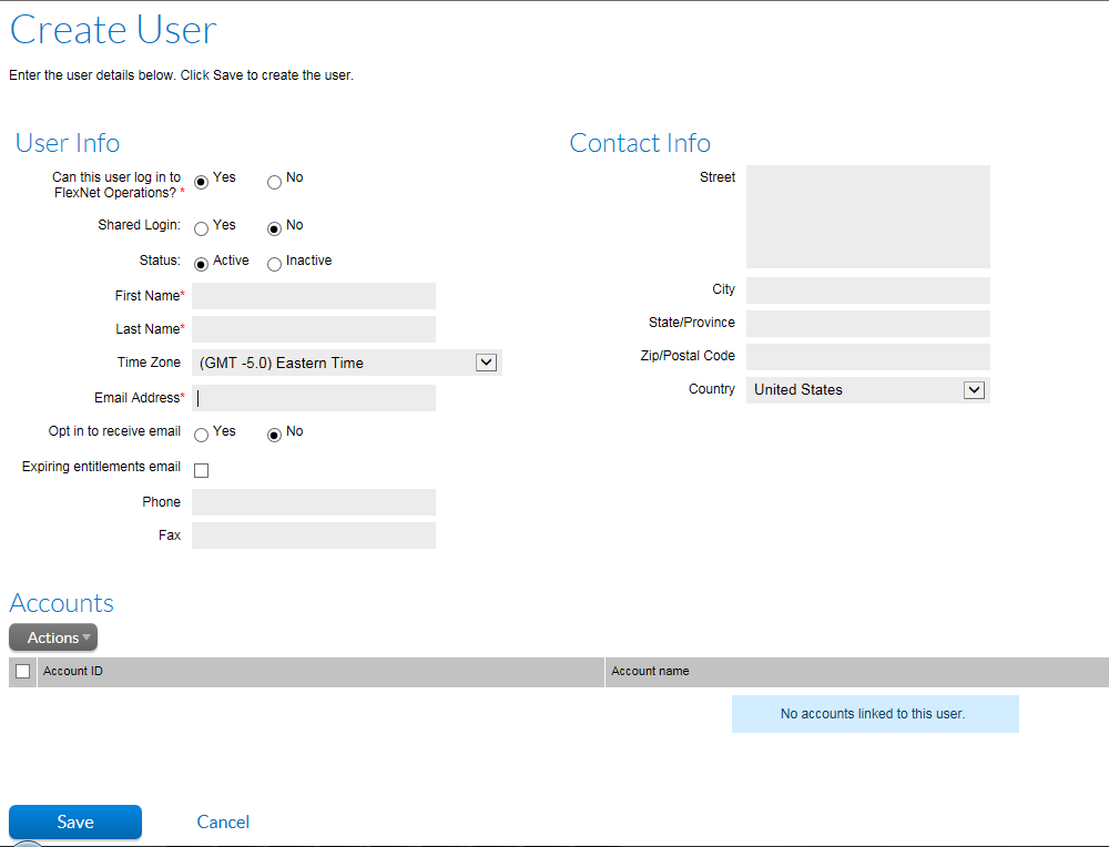 Your account will be listed. Click on “Actions” and then “Create”. Complete the web form required fields and any additional fields to the extent your organization requires. Link the new user to your account with the appropriate permissions.