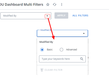 Type your keywords here: Type the data value on which you want to filter. A dropdown menu displays all data values for the selected field in the report or dashboard.