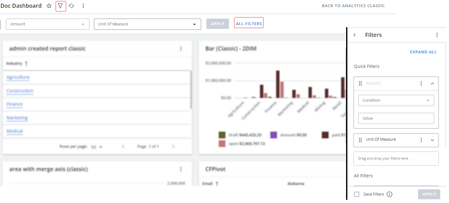 Filters can be used to narrow or focus your data and clarify findings. The Report Editor must first add fields to the filter drawer for the report or dashboard and then Report Viewers can apply filters to their view of the report or dashboard. If there are no filters available or you want to filter on data that is not available, contact the Report Editor. This section describes the filters that display in the All Filters section in the filter drawer, not on the top of the report or dashboard (Quick Filters).