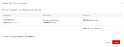 Note: When the report has dependencies or is a widget on a dashboard they display in the confirmation window. If you delete a report that is a widget on a dashboard, the report is deleted from the dashboard.