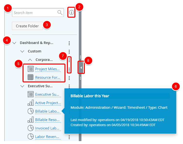 - Search item: Type the report, graph/chart, or dashboard name you want to search for in the box. The list updates and displays any report, graph/chart, or dashboard name containing the character(s) typed.
