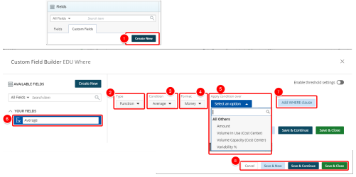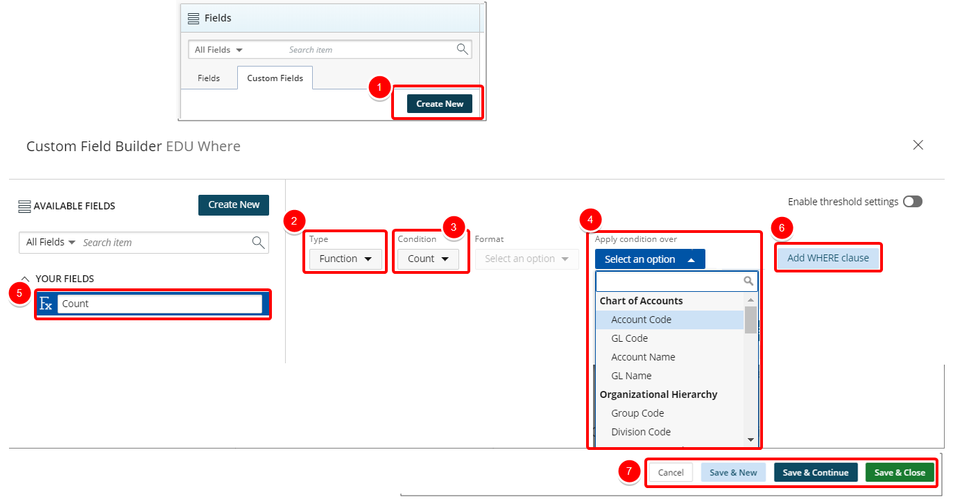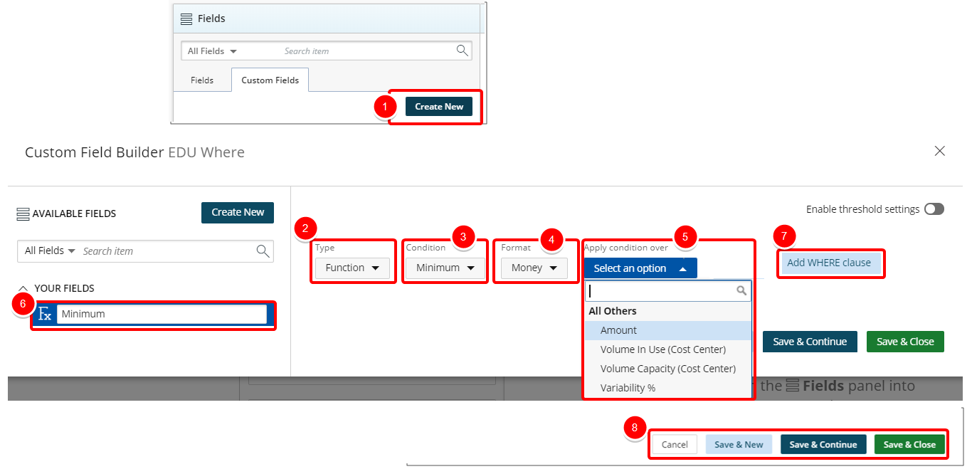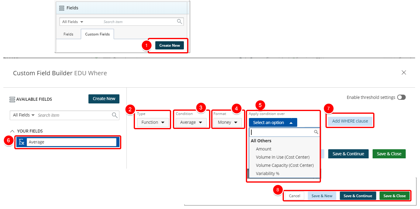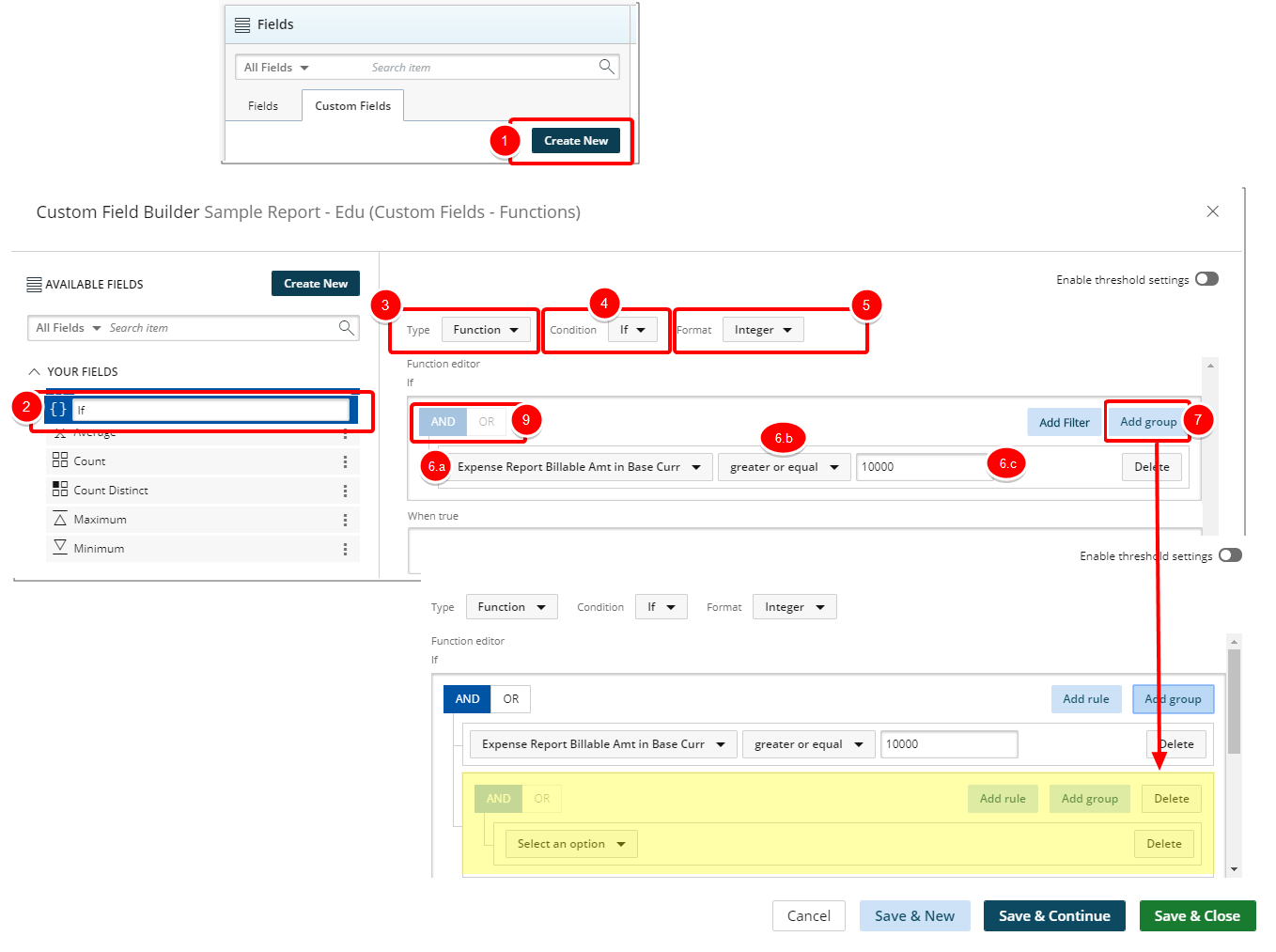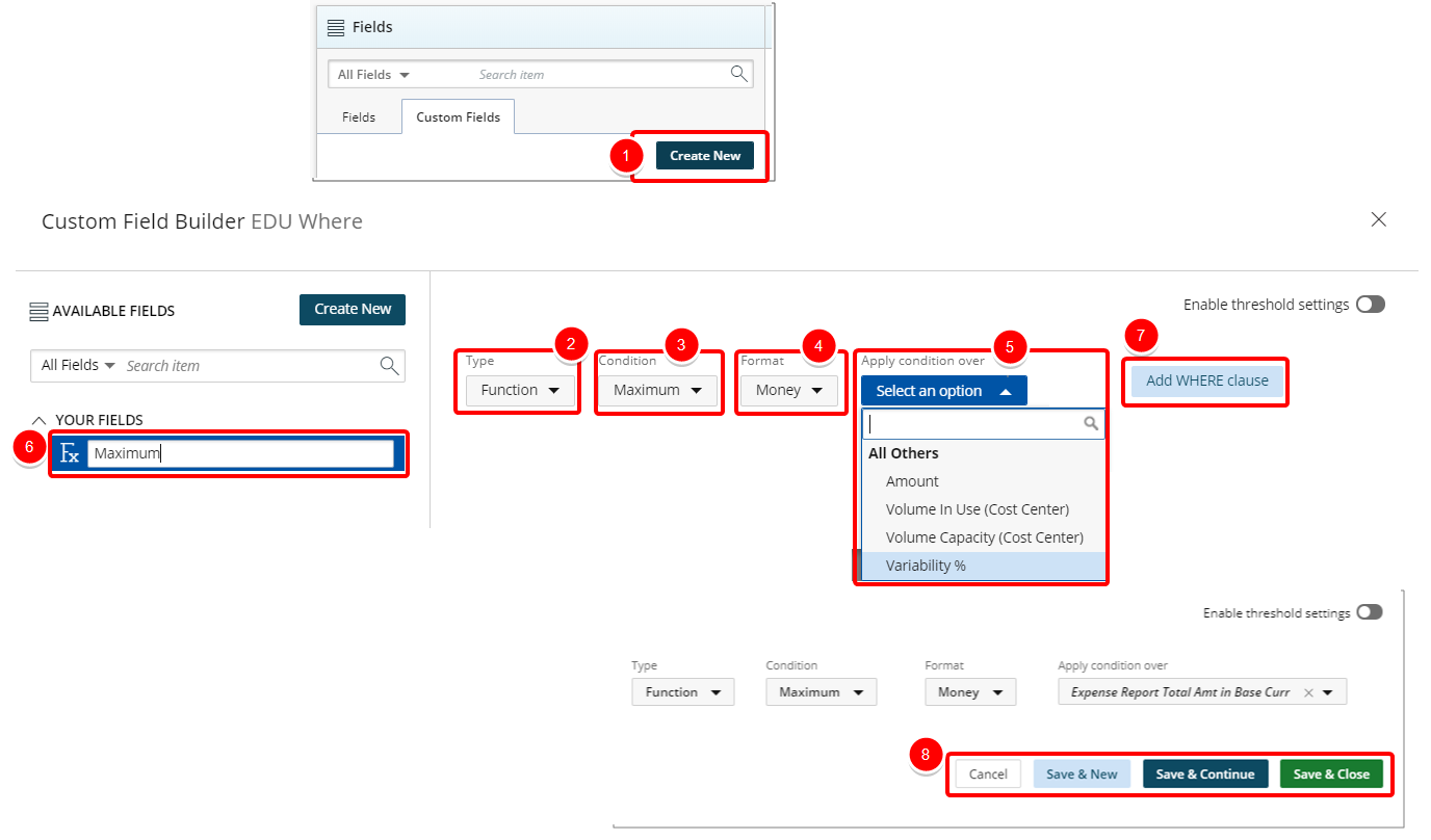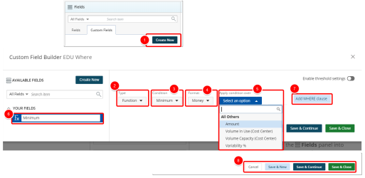 - Save & Continue to save the custom field and continue working on it. This is useful when working on a large formula or function.