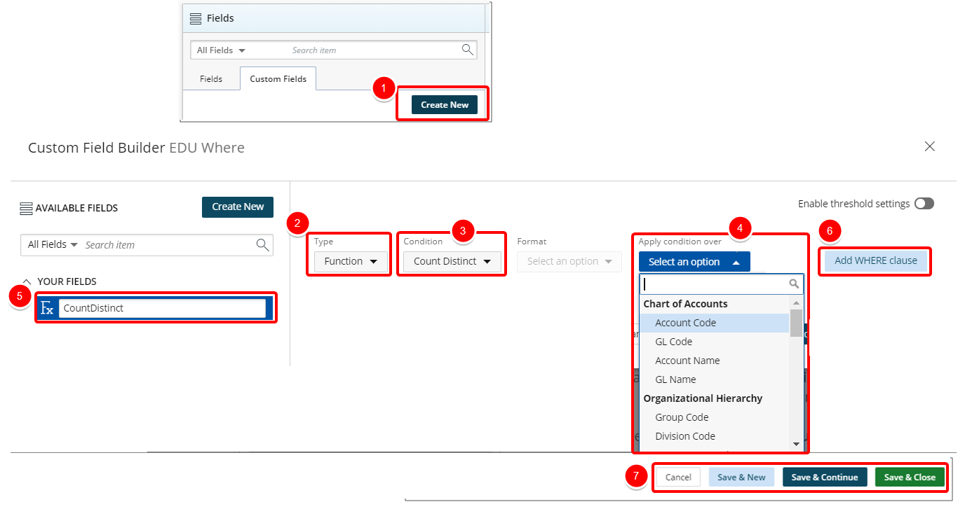 Note: When Count Distinct Condition is chosen, Format and Apply condition over options are enabled.