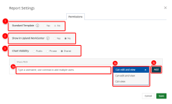 - Share: Allows you to set your report or graph/chart to be viewed by a specific user(s) or role(s) and give permissions. The Shared With field displays: