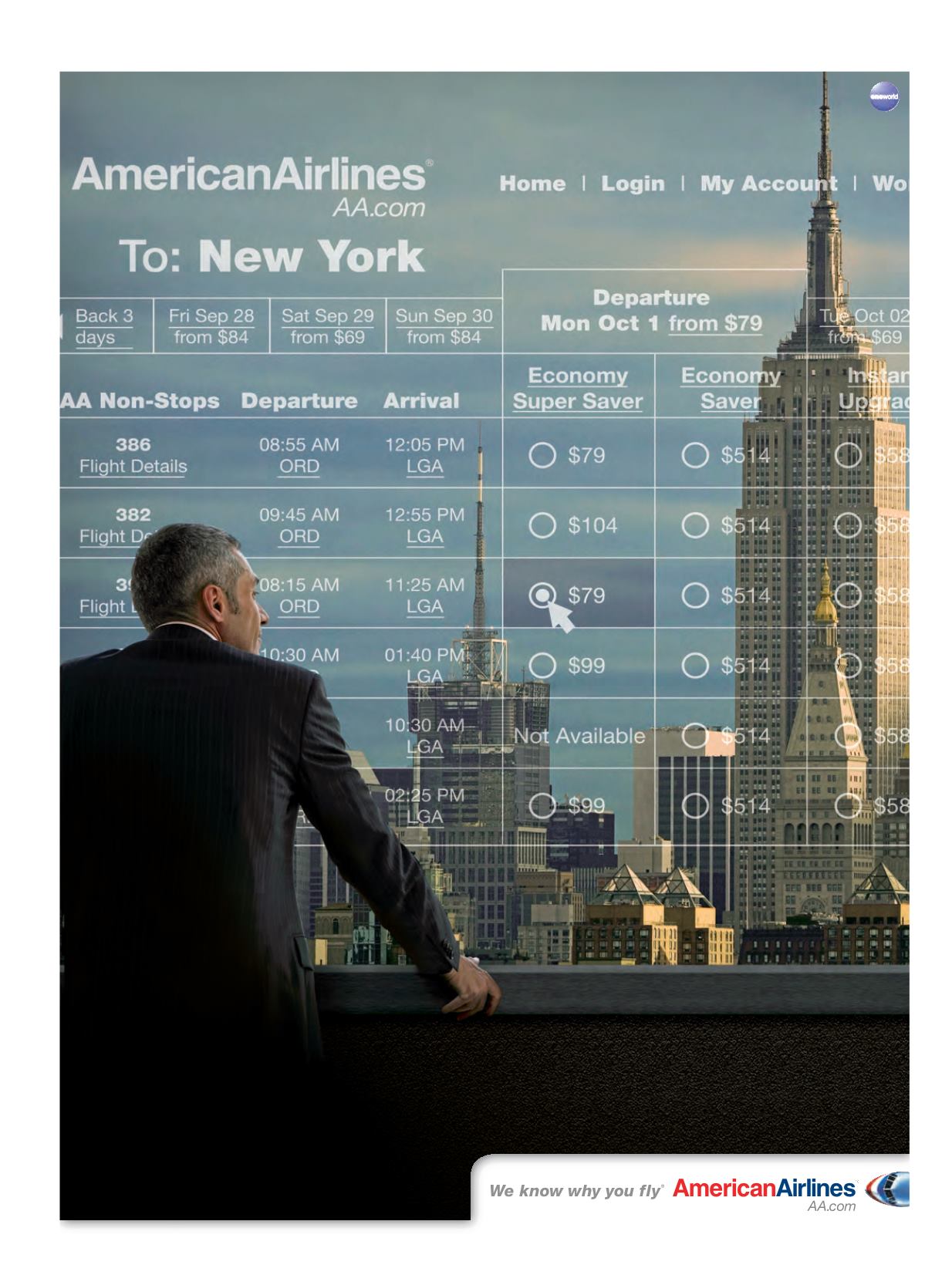 Sample one-way results fromORD to LGA as of 5/9/07. Taxes and fees of $10.40 apply. AmericanAirlines, AA.com andWe knowwhy you fly aremarks of American Airlines, Inc.