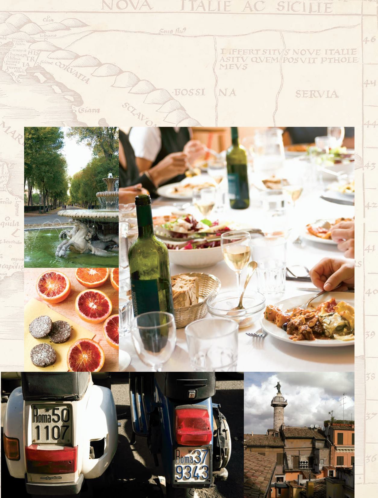 Roman scooters; a bustof Constantine outside theMusei Capitolini; preparinghomemade fegato bruschette