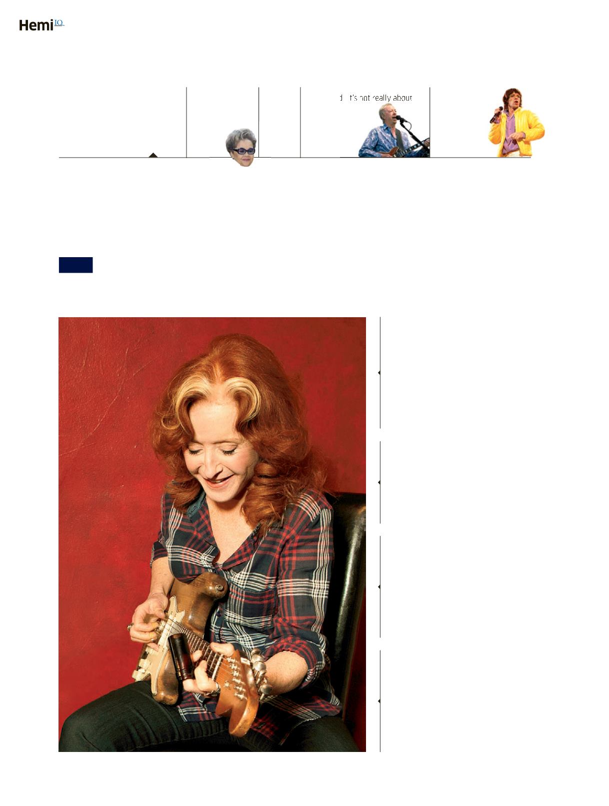 streaked redhair, BonnieRaitt cuts a singular figure. Thismonth, the66-year-old