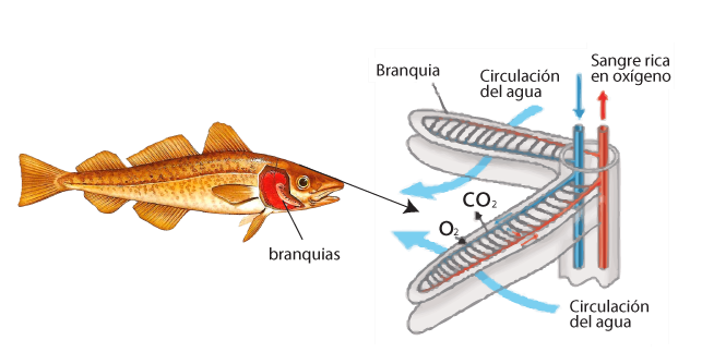 Es propia de animales acuáticos como los peces y los moluscos. Se realiza a través de órganos llamados branquias. Cada branquia consta de delgadas capas de células epiteliales y capilares sanguíneos. El oxígeno disuelto en el agua pasa a tráves del epitelio al capilar y de allí a la sangre. Los peces generan una corriente de agua al permitir que entre por la boca, pase luego a bañar las branquias y finalmente salga del cuerpo.