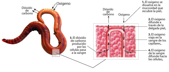 Se encuentra en animales simples que carecen de un sistema de conductos para transportar el oxígeno. El oxígeno entra directamente a las células por el proceso de difusión. Del mismo modo, el dióxido de carbono sale al medio. La lombriz de tierra presenta vasos sanguíneos en su piel que facilitan el transporte del oxígeno desde el medio hacia las demás células y del dióxido de carbono desde las células hacia el medio.