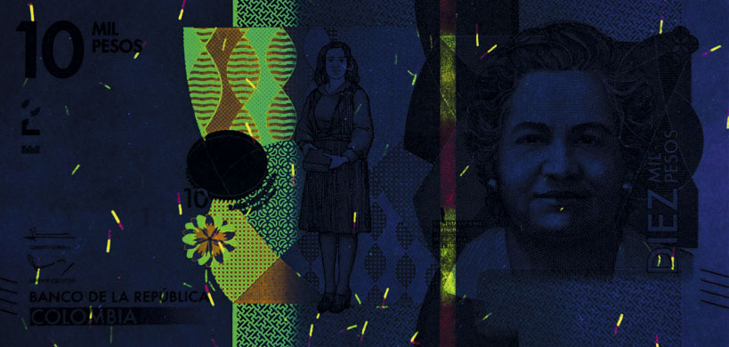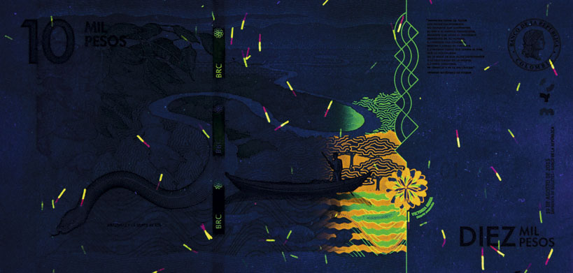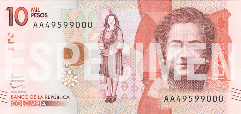 El rojo es el color predominante. En el anverso se aprecia la imagen de la antropóloga Virginia Gutiérrez junto con la rana arborícola y la flor de la Victoria regia. En el reverso se resalta el paisaje de la región amazónica en la que el río, que se acerca desde el horizonte, se convierte en serpiente y la representación de un pescador en una canoa y algunas especies animales.
