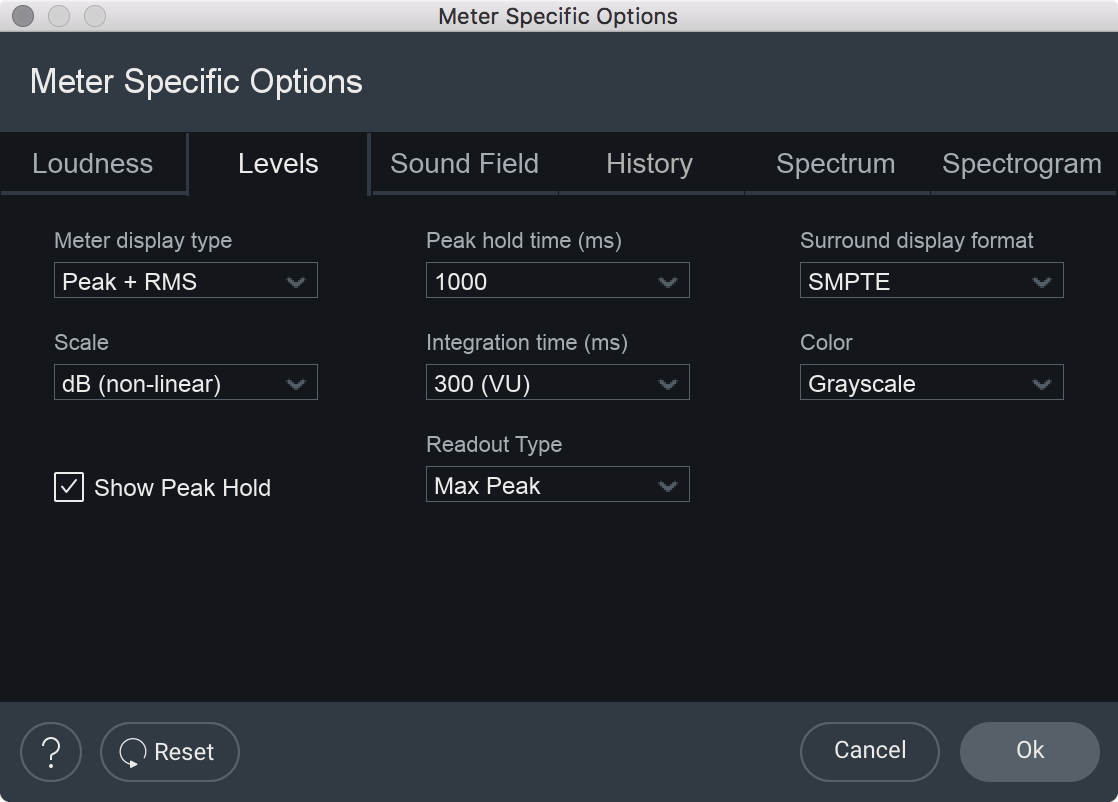 ピーク・ホールドの表示時間のサイクルを設定します。5ms、250ms、500ms、1000ms、5000ms、またはinfinite(無限)か ら選択できます。Infiniteに設定すると、メーターをダブル・クリックするまでピーク値の表示を保持し続けます。