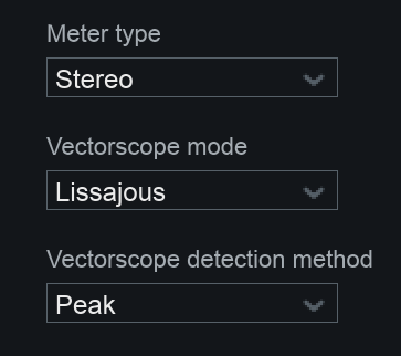 ステレオ・ベクトルスコープでのメーターの種類を選択します。この設定はステレオ・モードを選択中にサウンド・フィー ルド・メーター画面の下にある対応ボタンをクリックすることでも設定できます。