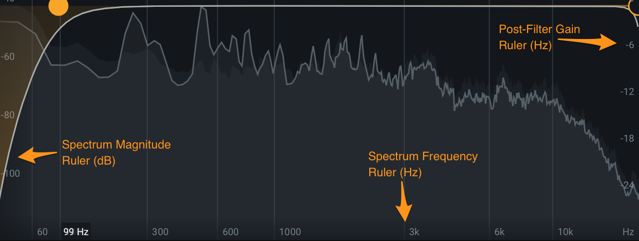 Displays the magnitude of a signal across the frequency spectrum in real-time. The vertical ruler on the left edge of the module panel measures the amplitude of the signal in decibels (dB). The horizontal ruler along the bottom edge of the module panel measures frequency in Hertz (Hz).
