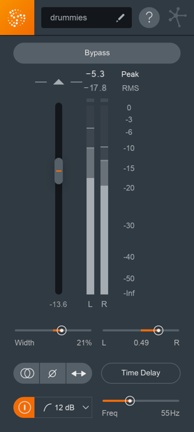 ステレオ幅を設定します。この数値を減らすと、ステレオ野は狭まり(-100%はモノ)、増加させるとステレオ野は広がります。これはステレオでミックスタップを使用する際にのみ機能します。