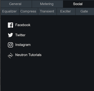 The Social tab contains links for you to explore iZotope’s social media platforms, such as Facebook, Twitter, and Instagram, and educational content platforms, such as our Youtube channel and our Tips & Tutorials for Neutron 3.