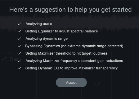マスターアシスタントを実行する場合は、トラックの中の最も音量の高い部分を再生することが肝要です。静かな箇所でマキシマイザーのスレッシュホルドを分析してしまうと、その部分に対して最適なラウドネスの最大化が行われます。レベルの低い箇所を基にしたスレッシュホルドを使用すると、より音量の高い箇所でディストーションを引き起こす可能性がありますのでご注意ください。