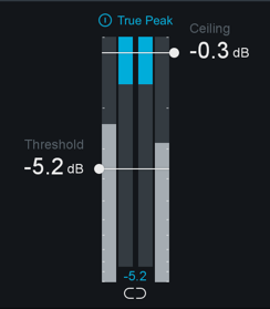 マキシマイザーの出力する最高レベルを設定します。一般的に、ディザー使用時は-0.3 dBが推奨値となりますが、マスタリングされるオーディオを.mp3または.aacへ変換する場合は、将来的なクリッピングを防止すべく、更に低いレベル(-0.6から-0.8)が推奨されます。