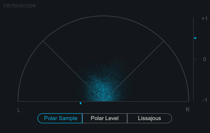 Polar Sample Vectorscope同様にLissajous Vectorscopeもサンプル毎に点をプロットしますが、全体が伝統的なオシロスコープのような表示画面となります。通常、Lissajous Vectorscopeは横ではなく縦に長いランダムのパターンでステレオ録音素材を表示します。 垂直方向の広がりは左右のチャンネルが似ていることを意味します(垂直の一本線で表示されるモノ信号に近いことを意味します)。水平方向のパターンは、2つのチャンネルに大きな違いがあることを意味しますので、モノ信号との互換性上の問題が発生する可能性があります。
