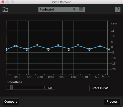 The Pitch Contour module lets you change the pitch of a selection over time. This can be used to quickly correct small pitch variations or gradual pitch drifts over time.