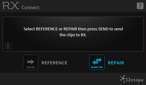 - 単にノイズプロフィールを作成する、あるいは分析のみを行う場合は、‘Reference’を選択し、オーディオを単一方向に送出します。双方向の作業を行う場合は‘Repair’をクリックした上で‘Send’をクリックします。これによりRXオーディオエディターが開きます。