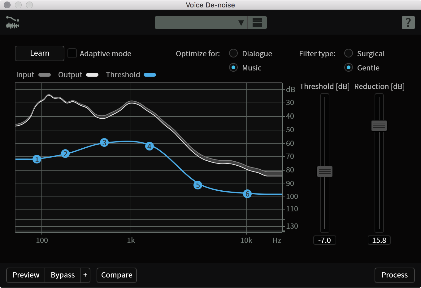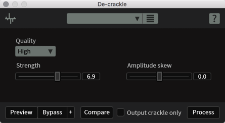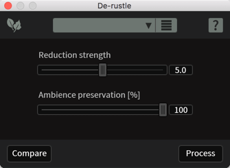 - De-rustle(布擦れ音除去): ダイアログに混入することのある、ピンマイクの布擦れ音や、それに類するノイズを除去します。