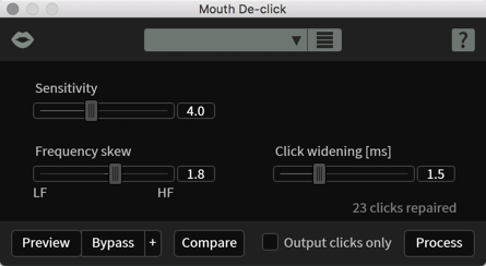 - Mouth De-click(マウスクリック除去): ダイアログ、ボーカル、そしてボイスオーバーを綺麗に整えるために設計された新モジュール兼プラグインにより、口内クリックや舌鼓が簡単に除去できます。