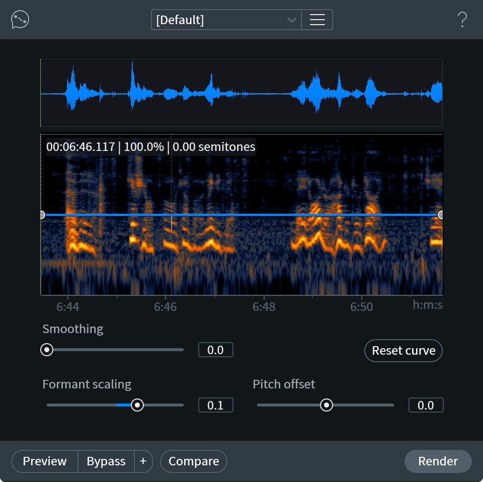 より全般的かつダイアログに特化していないピッチ・エンベロープを扱う場合、Variable Pitch(可変ピッチモジュールをお試しください。可変ピッチモジュールは、選択範囲に対し、タイミング維持の有無に関係なくピッチシフトを施すことができますので、より広範な入力マテリアルに対する使用に向いています。