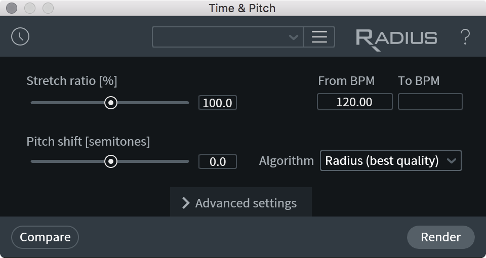 - RADIUS: designed to work well with polyphonic material such as mixes with more than one instrument, as well as non-harmonic material such as drum loops or rhythmic audio. This is the highest-quality option for most sources.