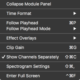 - Show Channels Separately: Toggles how channels are displayed in the spectrogram/waveform view. When enabled, each channel will be drawn in its own lane in the main editor view. When disabled, the channels are drawn in one summed view. This allows for greater vertical resolution, especially when working with multichannel files. This option can also be toggled on or off by: clicking the Channel View button to the left of the mini waveform overview display or by using the following keyboard shortcuts: Command+Shift+C (Mac); Ctrl+Shift+C (Windows).