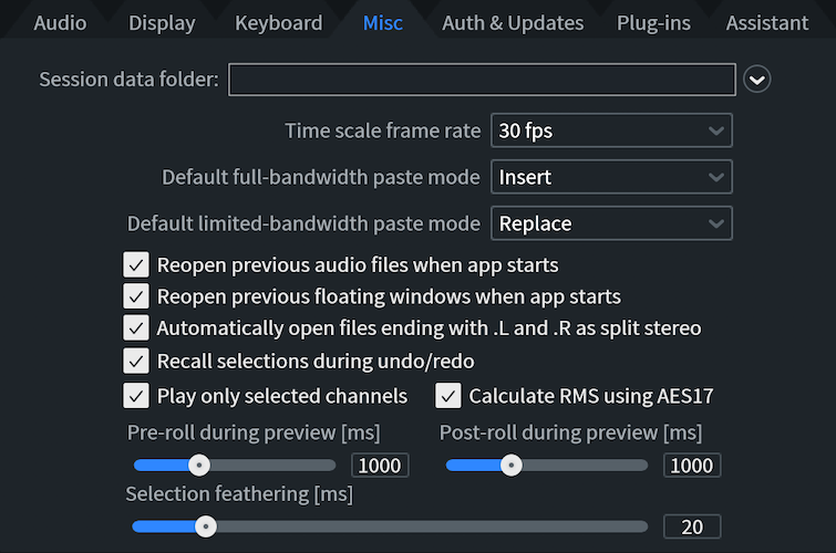 - **Pre- and Post-Roll during preview (ms)(視聴時のプリ/ポストロール):**モジュールで処理したオーディオを視 聴するとき、オーディオの処理前後を対比できるように視聴範囲の前後に特定の秒数のウェイトを入れます。