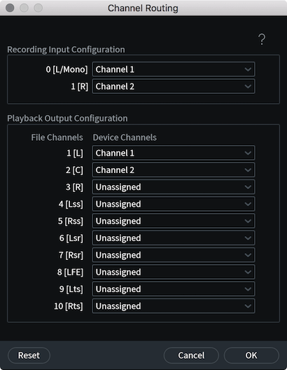 - Channel Routing(チャンネル・ルーティング) チャンネル・ルーティングの画面を開きます。ASIO/CoreAudioのド