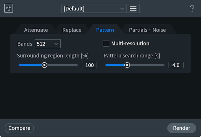 このモードでは周囲にある音声成分で最も類似している箇所を探し出し、音声の破損箇所と置き換えて補間します。パター ンのモードはバック・グラウンドのノイズが乗っている、あるいは繰り返し部分のある、破損の激しいオーディオに最適で す。