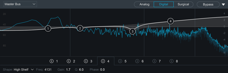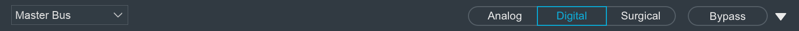 - SURGICAL(整形): ここが選択されると、精密なデジタルフィルターが全EQ帯域に使用されます。整形モードでは選択されたフィルター形状のみ使用可能です。