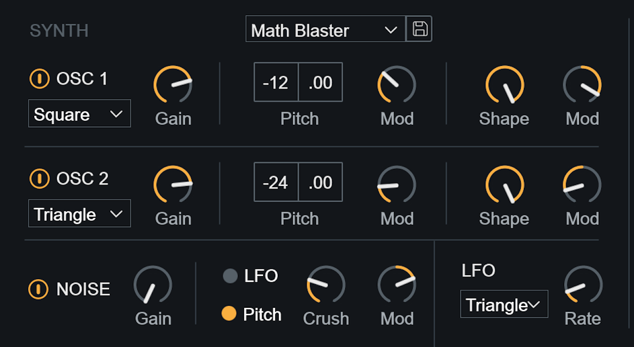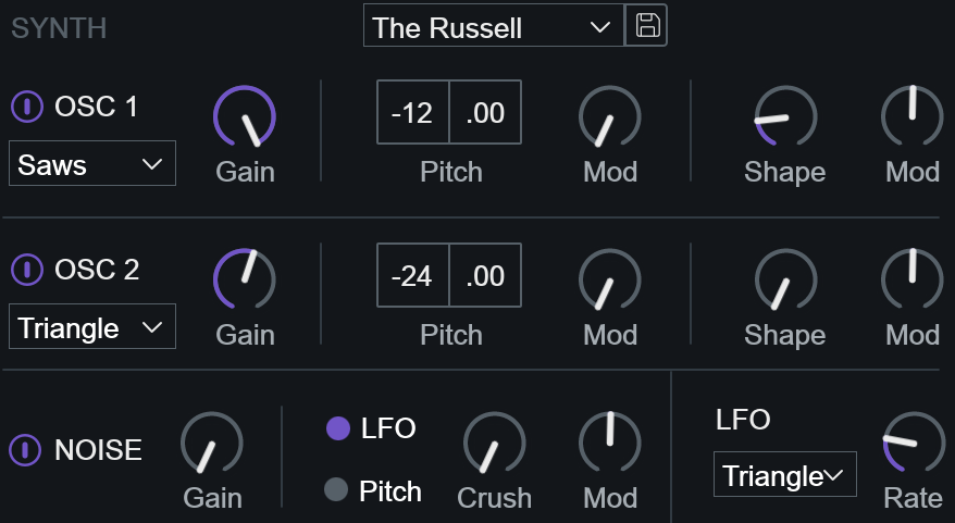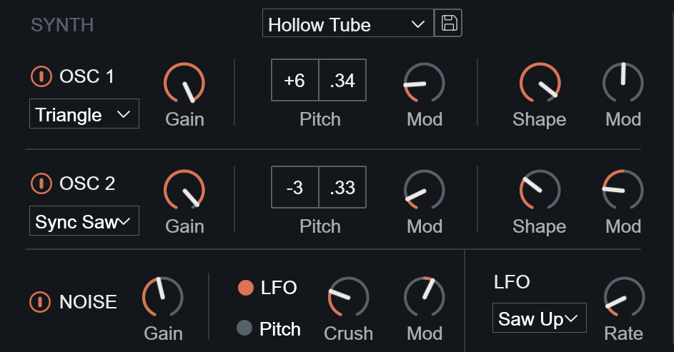 VocalSynth listens to the incoming audio and detects pitch information based on the range selected in the Pitch controls area. The pitch information it detects informs the notes played by the internal synth engine. The notes played by the synth can be further customized by adjusting the auto voice parameters in the Voicing panel.