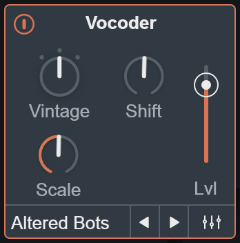 VOCODER: This panel includes the main Vocoder module controls, Vocoder synth preset selector and access to the Vocoder Advanced View by clicking on the mixer icon to the right of the synth preset previous/next buttons. |