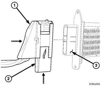 Connect the wire harness connector (1) to the PTC heater unit (3) while pushing upward on the connector lock (2). Make sure the wire harness connector and lock are fully engaged.