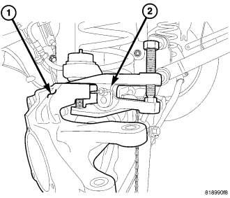 Separate the upper ball joint from the knuckle (1) using special tool 9360 separator (2).