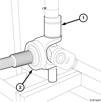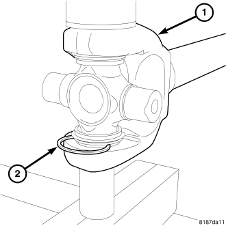 Press bearing cap into stub shaft yoke (1) until bearing cap snap ring groove is visible and install snap ring (2).