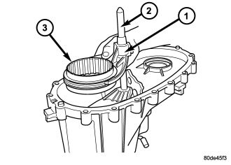 Remove mode fork (1), mode sleeve (3), and shift rail (2) as assembly. Note which way the sleeve fits in the fork (long side of sleeve goes