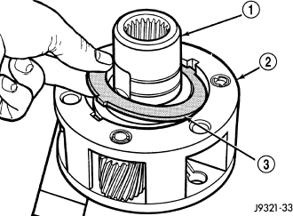 Remove output bearing (2) retaining ring (3) with heavy duty snap-ring pliers.