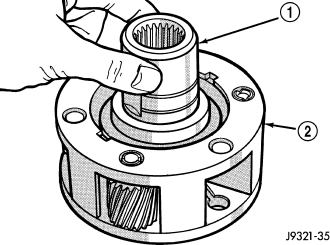 Place front case in horizontal position. Then remove input gear and low range gear as an assembly (2). Tap gear out of bearing with plastic