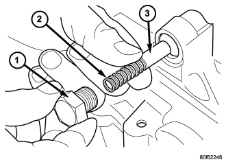 Remove the detente plug (1), spring (2), and plunger (3) from the transfer case.