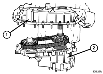 Note position of bolts that attach rear case (1) to front case (2). Some bolts are unique. Mark position of these bolts with paint or scribe.