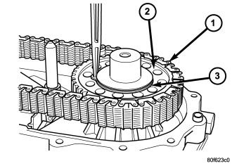 Remove the snap-ring (3) that secures the chain drive sprocket (2) onto mainshaft (1). Use standard (instead of parallel jaw) snap-ring pliers