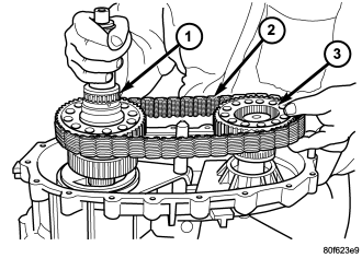 Remove mainshaft (1), front sprocket (3), and chain (2) as an assembly.