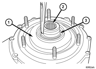 While using suitable snap-ring pliers to spread the input gear bearing snap-ring, press downward on the retainer (1) to remove the bearing (3).