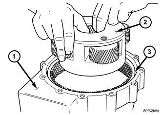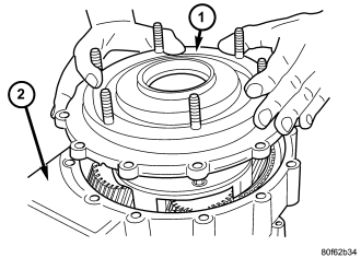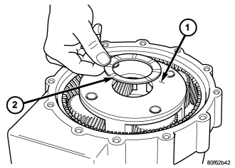 Remove the low range planetary (1) plastic spacer (2) from the planetary carrier or back side of the input retainer.
