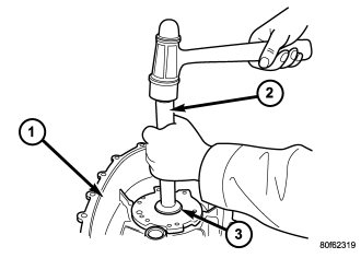 Remove the rear output shaft bearing with Universal Handle C-4171 (2) and Installer 8239 (3).